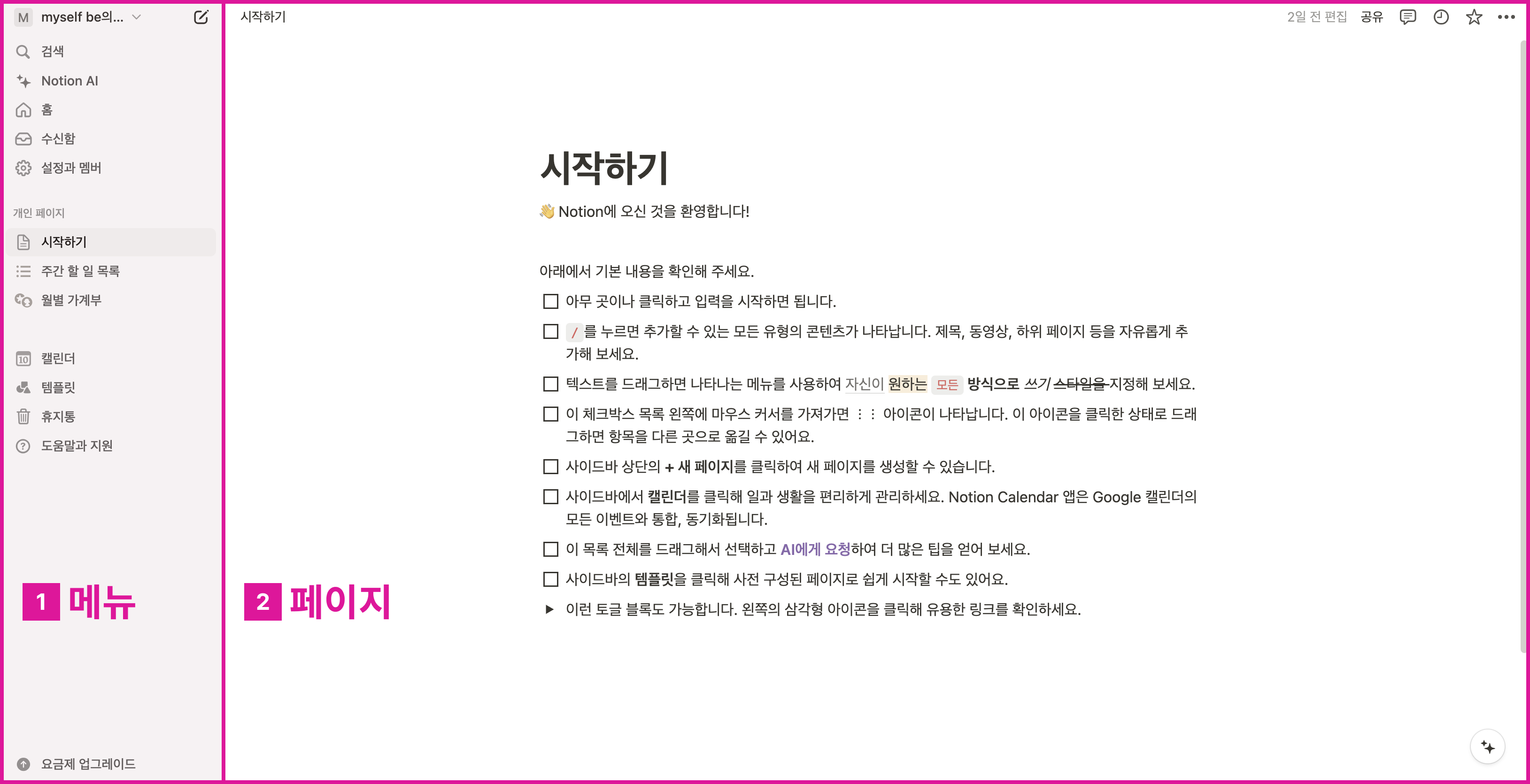 노션은 좌측에 메뉴와 우측에 페이지로 구성되어 있습니다. 처음 가입하면 노션에서 제공하는 가이드라인 페이지로 접속하게 됩니다. 이 내용들은 삭제해도 괜찮습니다. 처음 이용하는 분들을 위해 제공되는 페이지이니까요.