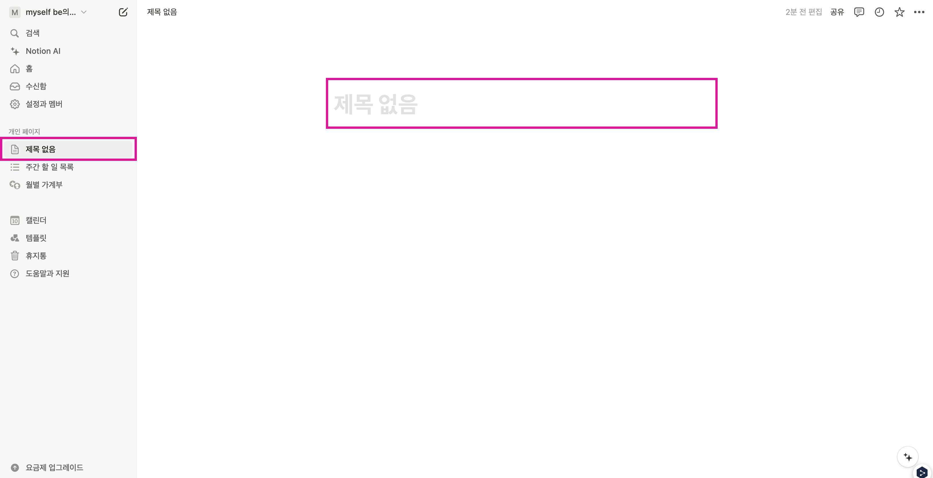 처음 접속한 화면의 내용들을 모두 삭제하면 아래 이미지처럼 보입니다. 페이지 제목에 내용이 없어서 메뉴의 페이지 이름이 '제목 없음'으로 바뀌는데요. 좌측에 있는 메뉴는 사용자가 생성한 페이지 목록으로 구성되어 있기 때문에, 페이지에 제목을 입력하지 않으면 메뉴에서도 똑같이 '제목 없음'으로 표시됩니다.
